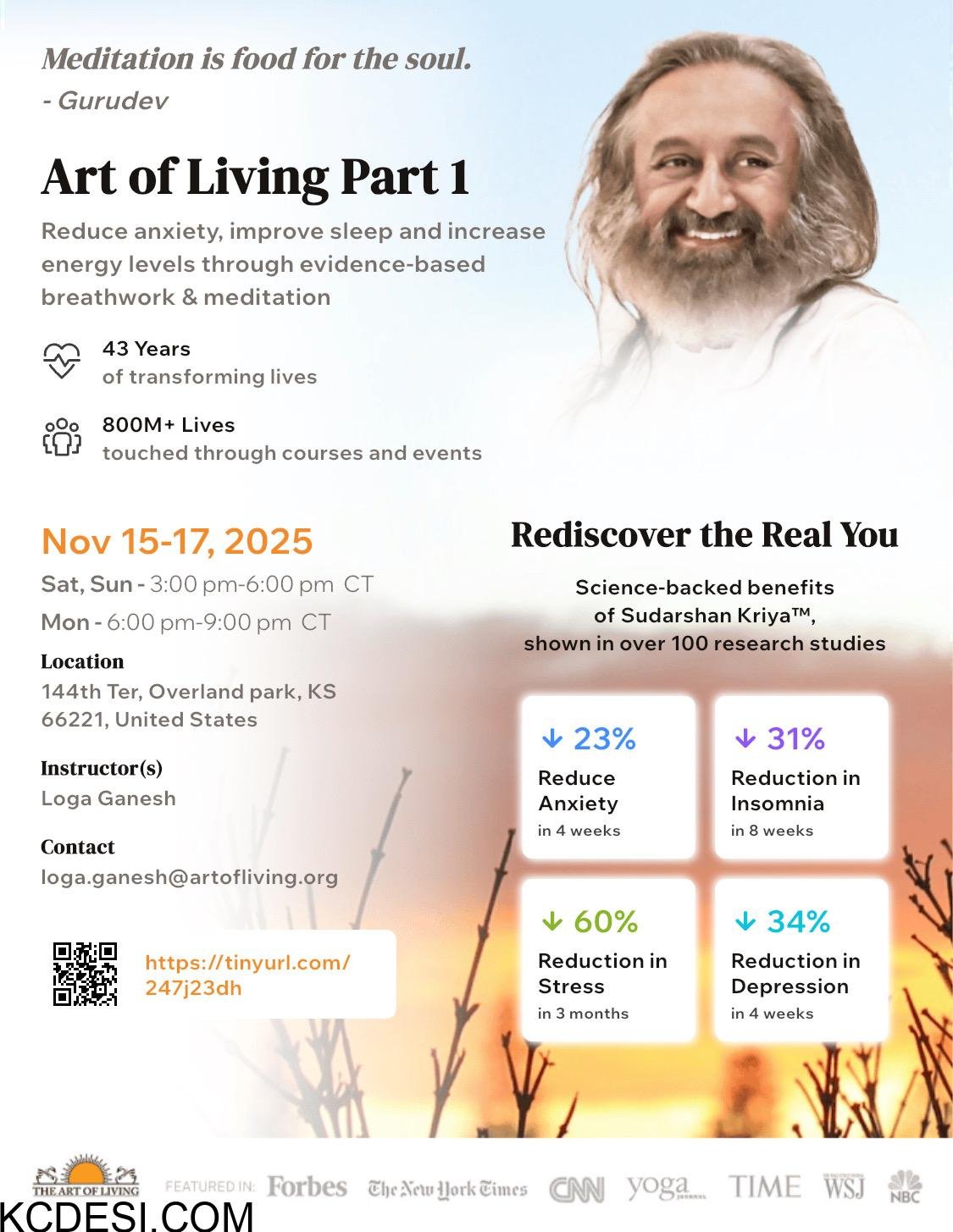 Join the Art of Living Part 1 Course, a 3-day immersive experience where you’ll learn SKY Breath Meditation—a technique used by millions worldwide to reduce stress, enhance energy, and improve sleep. Includes LIVE access to Gurudev Sri Sri Ravi Shankar!