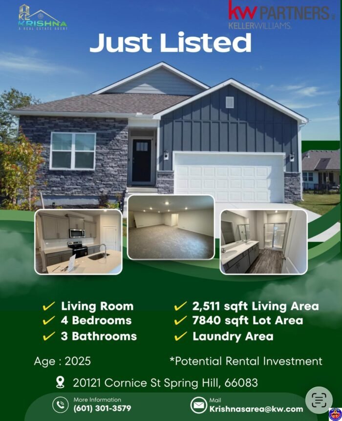 If you’ve been searching for the perfect home in the Kansas City metro area, this one is hard to beat. Krishna, A Real Estate Agent with Keller Williams Partners, has just listed a beautiful 4-bedroom, 3-bathroom home at 20121 Cornice St, Spring Hill, KS 66083 — and it checks every box. Built in 2025, this DR Horton Newcastle model spans 2,511 sqft of living space on a 7,840 sqft lot, and it still feels brand new because it basically is. From luxury vinyl plank floors to quartz countertops, every detail has been thoughtfully finished and move-in ready from day one.