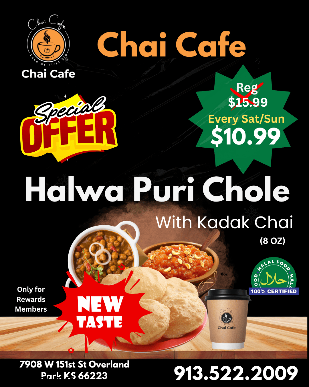 Enjoy our all-newย Halwa Puri Choleย combo, paired perfectly withย 8 oz Kadak Chaiย for a hearty and flavorful treat. ๐โ