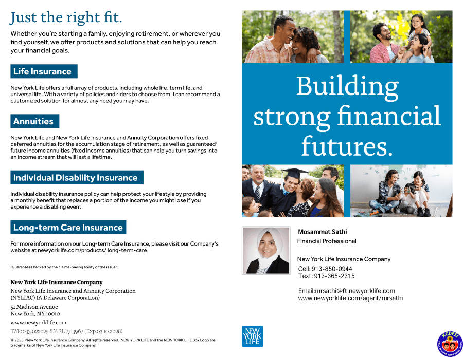 As a mutual life insurance company with no obligations to stockholders, New York Life’s singular focus is on its policyholders — and that philosophy shines through in the way Mosammat approaches every client relationship. Whether you are just starting a family, planning for retirement, or protecting a business you’ve built, Mosammat is ready to help you find just the right fit. Reach her by cell at 913-850-0944, by text at 913-365-2315, by email at mrsathi@ft.newyorklife.com, or visit her online at https://newyorklife.com/agent/mrsathi